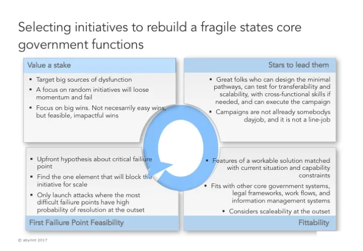 Rebuilding governments of fragile states requires agility. This is a buzzword concept, admittedly a dated one, but probably a relevant one for fragile states. Selecting the reform initiative is the critical step in being agile.