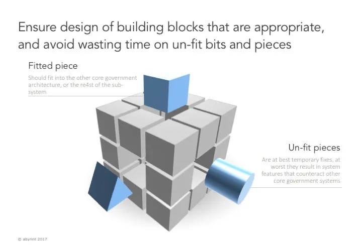 Fragile states governments would ideally have the capability to recognize the core systems features needed, and scale and fit solutions across the system. These are scarce skills. This requires a system design capability, that is a scarce and highly valued skill, anywhere in the world.